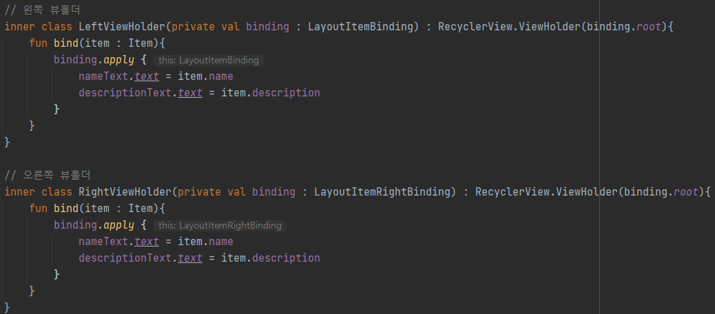 inner class LeftViewHolder(private val binding : LayoutItemBinding) : RecyclerView.ViewHolder(binding.root){