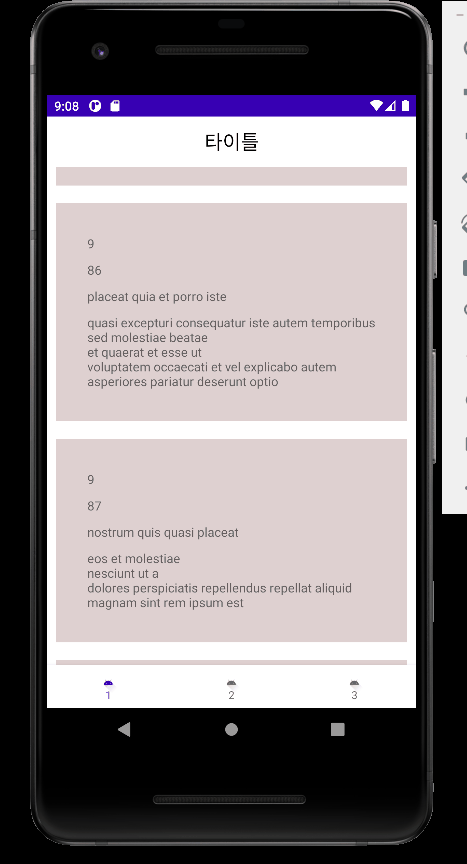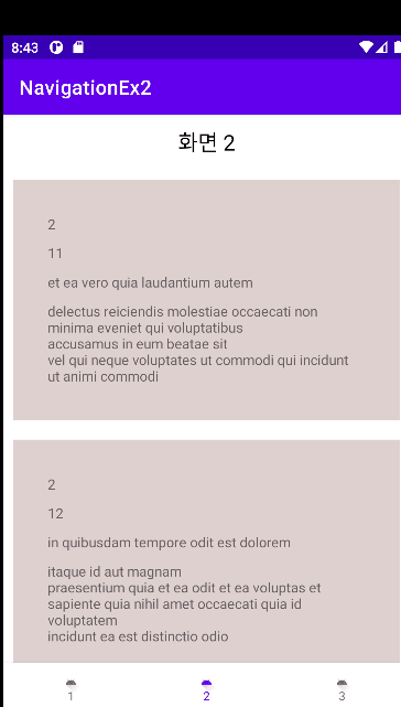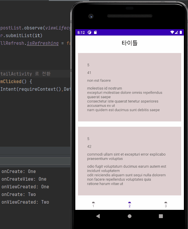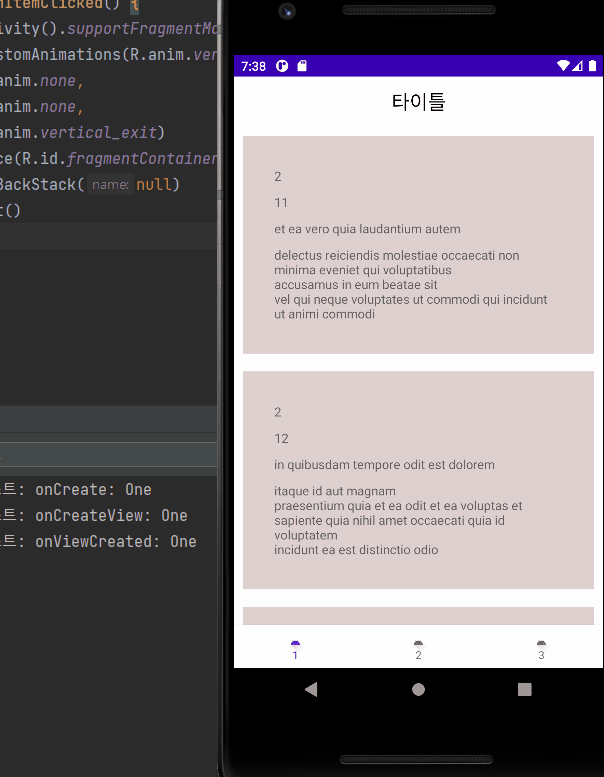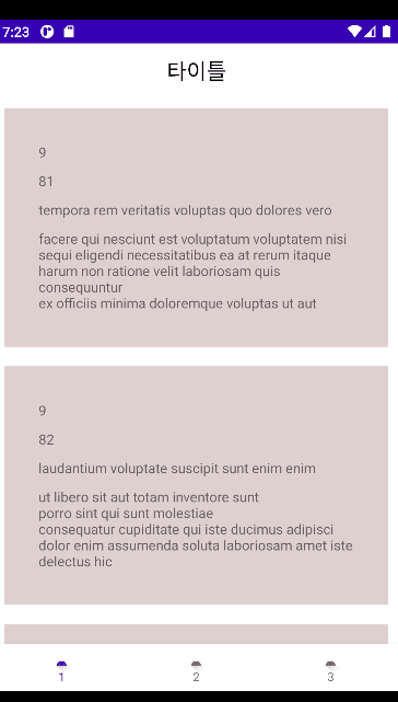 1번, 2번 프래그먼트는 각각 임의의 데이터를 서버로부터 불러와 보여준다.