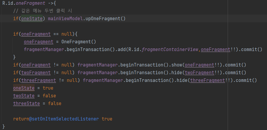 그 후 연속으로 클릭되었다면 아까 OneFragment에서 관찰하고 있던 상태를 바꿔주는 메서드를 호출한다.