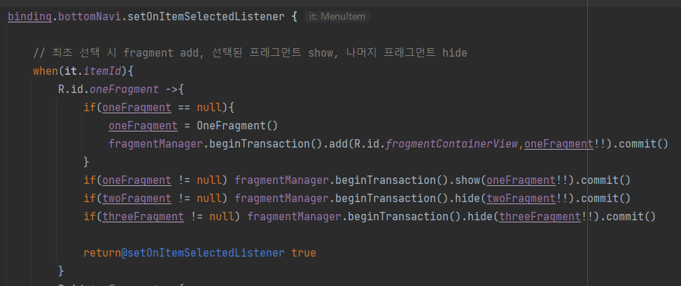 binding.bottomNavi.setOnItemSelectedListener {